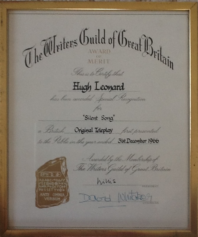 The second curiosity is the “Award of Merit” from the Writers Guild of Great Britain in 1966 for Silent Song. I have been in touch with the Guild and they advise that awards were made throughout the 1960s but no systematic record was kept. So the actual framed award is the only evidence of its existence. “Silent Song” is well evidenced: it was a big deal in its day and deserves its own, future post. Meanwhile I reproduce the award here for the record.